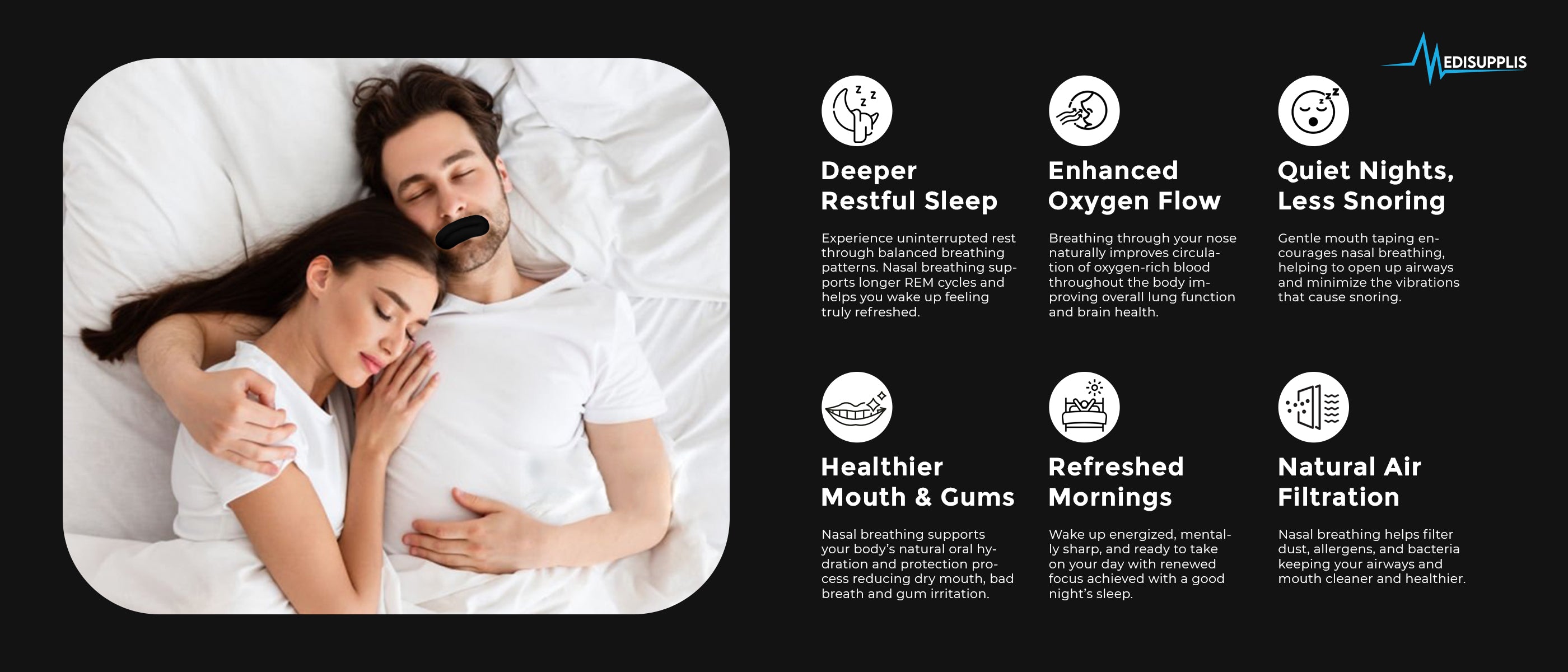 A soft, skin-friendly adhesive tape designed to keep your mouth gently closed during sleep — encouraging nasal breathing to reduce snoring and improve sleep quality.